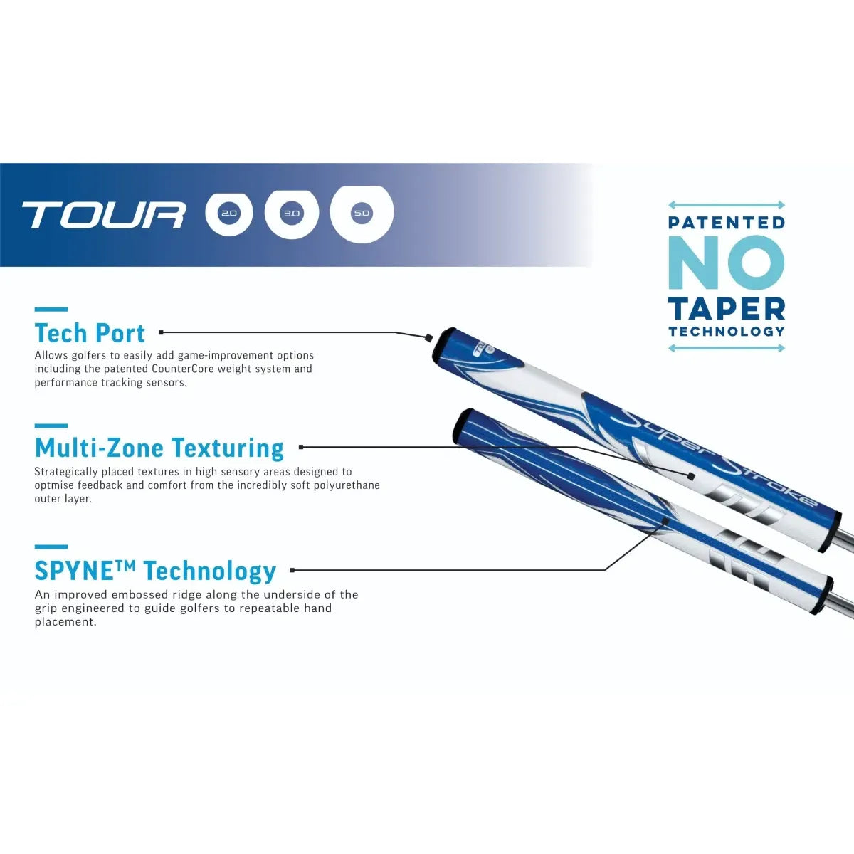 Enhanced Spyne™ Technology – The new Spyne™ Technology has an improved, embossed ridge along the underside of the grip, engineered to make it easier to square the face at impact.New Multi-Zone Texturing – Strategically placed textured in high-sensory areas designed to optimize feedback and comfort from the incredibly soft polyurethane outer layer.No Taper Technology – Our patented No Taper minimizes grip pressure with an advanced parallel design that enables golfers to quiet their hands and add consistency to their strokes.*Tech-Port – Located at the top of SuperStroke grips, Tech-Port allows golfers to easily add game-improvement options including the patented CounterCore weight system and performance tracking sensors.